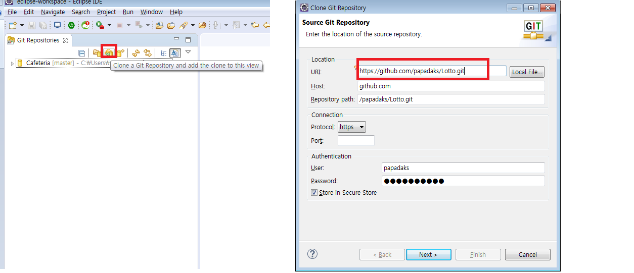 8.이후 나오는 창에서 우리가 만든 git 주소를 입력합니다. 그 다음 Finish 버튼 클릭
