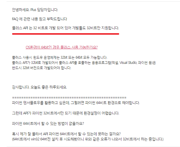 플러스 API가 32Bit로 개발되어 있기 때문이라고 한다.