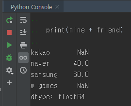 나는 kakao 주식이 있지만 친구는 업고 반대로 나는 w games가 없지만 친구는 있어서 더하면 NaN ( Not a number)가 나옵니다. 그럼에도 둘 다 갖고 있는 naver, samsung은 알아서 잘 더해줍니다.