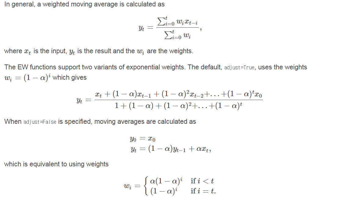 default 설정인 adjust=True는 지수이동평균의 가중치 통해 초기값의 불균형을 조정해준다는 뜻이고