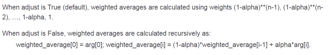 default 설정인 adjust=True는 지수이동평균의 가중치 통해 초기값의 불균형을 조정해준다는 뜻이고