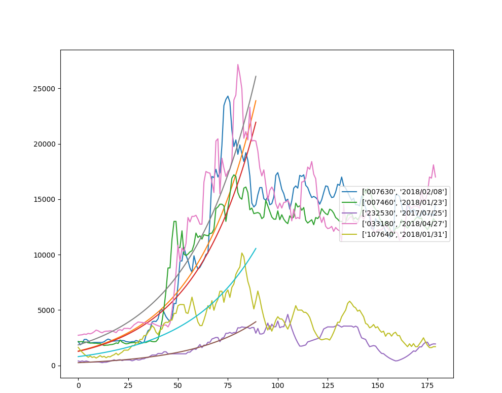위 코드를 수행하면 모멘텀이 가장 큰 기업 5개를 그려냅니다.