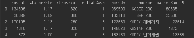 이와 같은 구조에서 result 밑에 eftItemList(실제 ETF 정보들이 들어있는 부분)을 json_normalize를 통해 DataFrame으로 바꿔주는 과정을 통해 나온 ETF DataFrame을 출력해보면 다음과 같습니다.