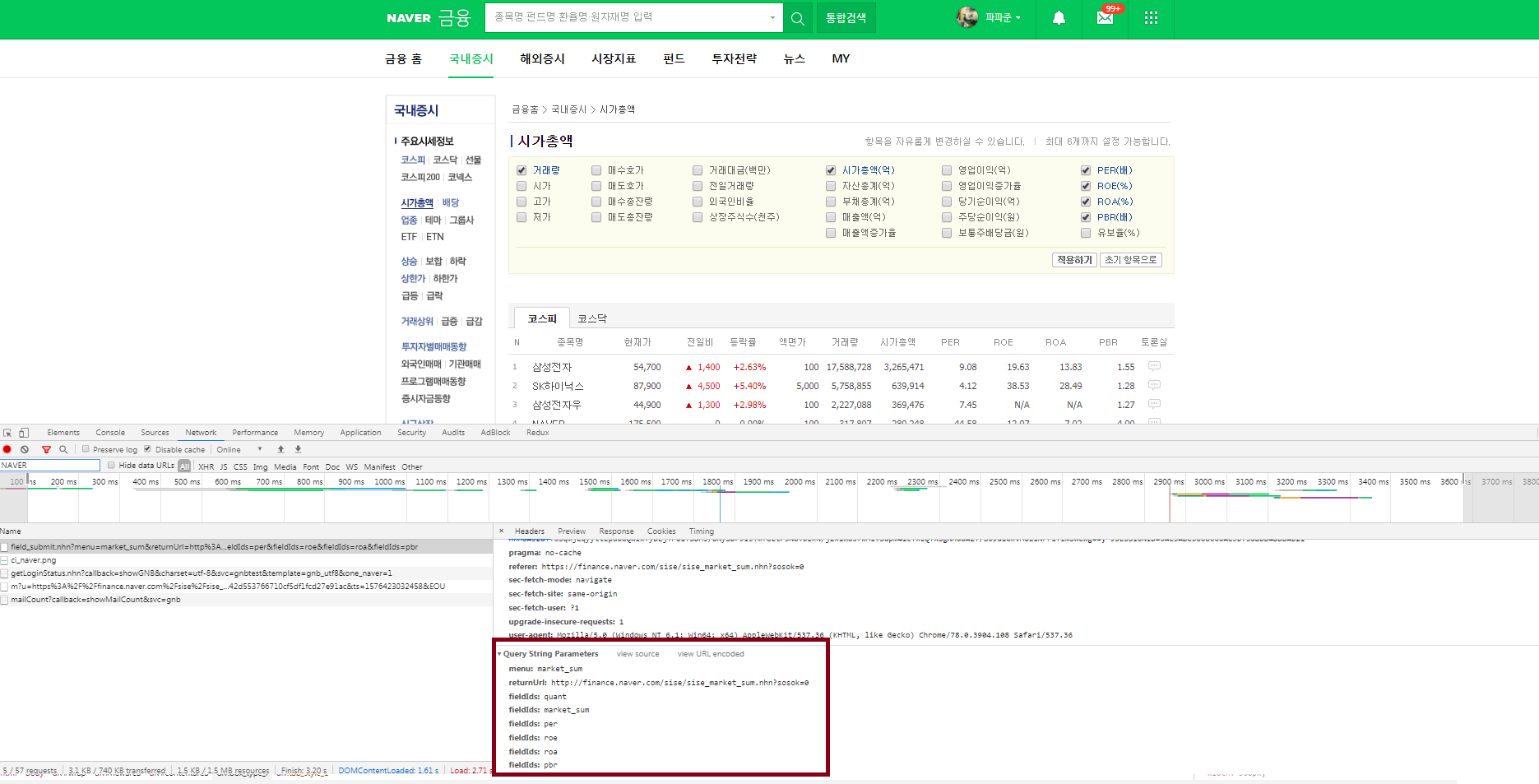 Chrome 개발자 도구에서 network를 확인해보면 https://finance.naver.com/sise/field_submit.nhn 로 위의 이미지와 같은 data를 담아 post 요청을 보냅니다.