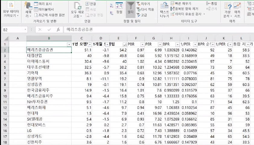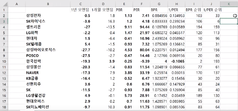 각 주식마다 PBR, PER, 1달/1년 등락율을 계산 (강환국님은 퀀트킹이라는 유료 프로그램을 이용하심)