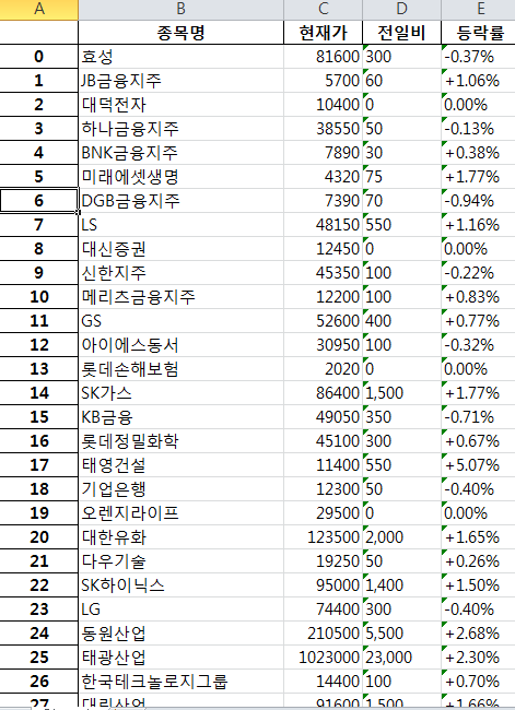 - NaverFinance.xlsx에는 PER, PBR과 같은 정보들이 있고 시가총액 기준 정렬이 되어 있습니다.